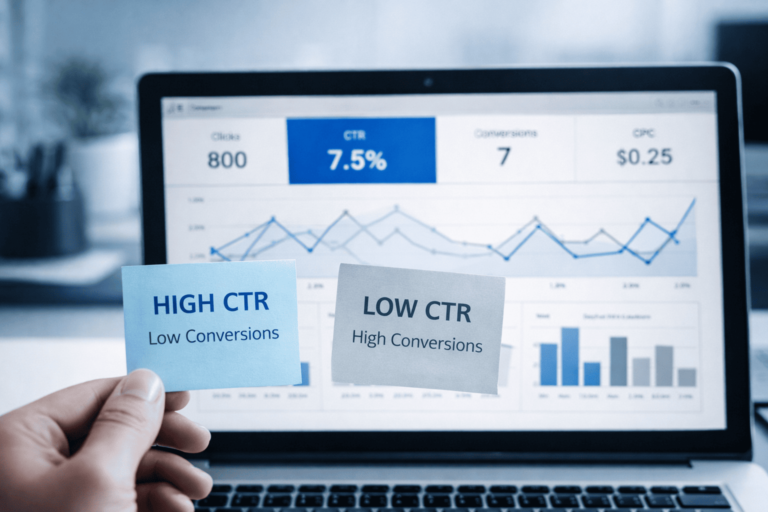El CTR (Click Through Rate) indica qué tan atractivo es un anuncio, pero no qué tan rentable es. Un CTR alto puede significar curiosidad, no intención.